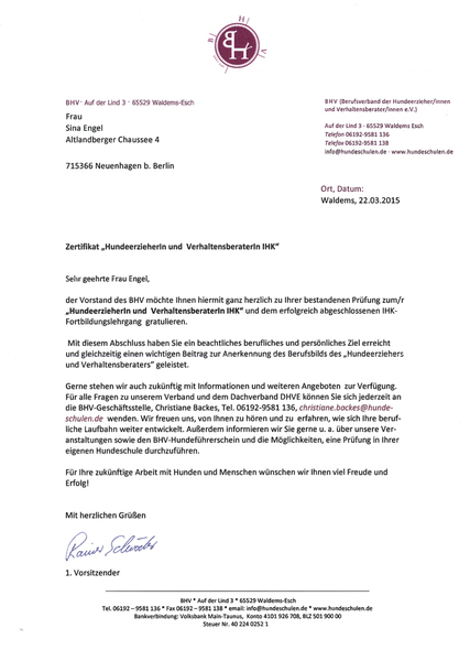 - Vollmitglied im Berufsverband der Hundeerzieher und Verhaltensberater e.V. (BHV)