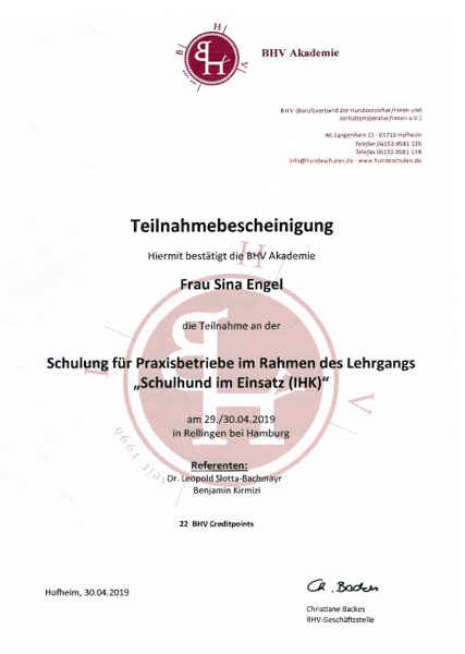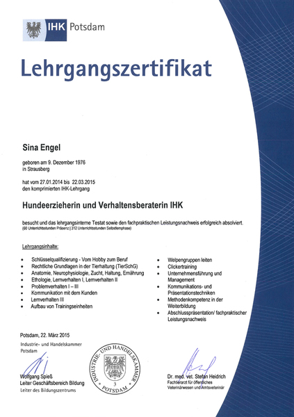 - Hundeerzieherin und Verhaltensberaterin (IHK)