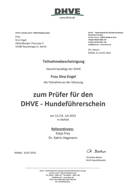 - Prüferin Hundeführerschein (BHV e.V.)